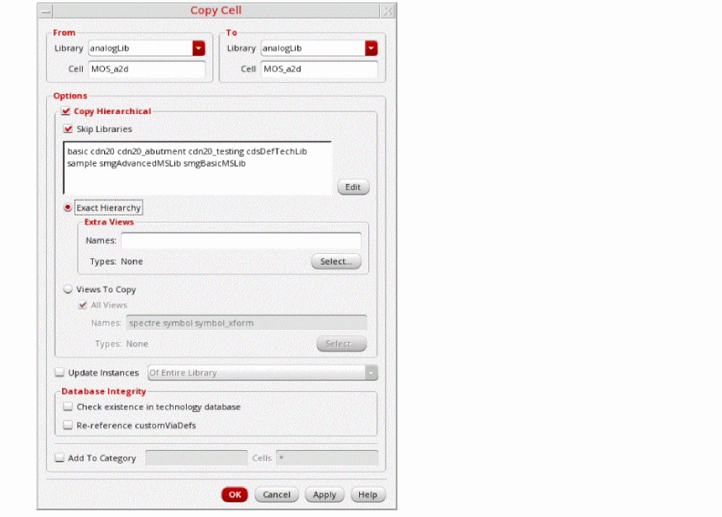 The Copy Cell form appears.The selected library and cell appear in the Library and Cell fields in the From group box. They also appear in the Library and Cell fields in the To group box. You can change any or all of these values.