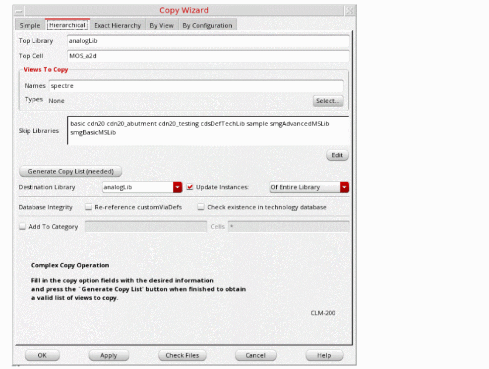 To copy a hierarchy of libraries, cells, and views into another library, follow these steps: