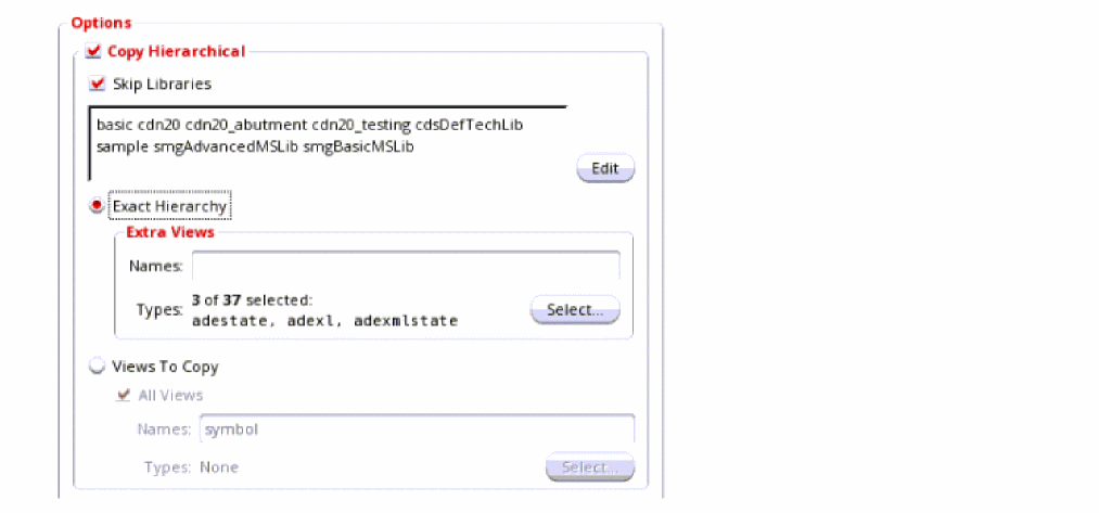 The Extra Views box becomes active. If you include additional view names or view types in this box, the search is expanded to include any matching views found in your design hierarchy in the copy operation. If any of these matching views have their own hierarchies, those additional hierarchies are also included.