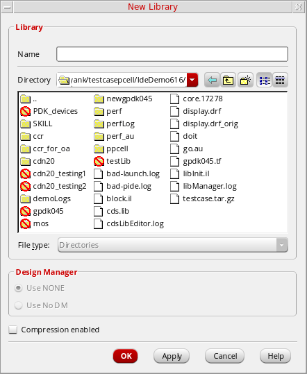The software suggests a design management system if it has been specified with the DMTYPE property in acdsinfo.tagfile that is not library-specific but included in the search path. While creating a new library, the design management (DM) information is stored in thecdsinfo.tagfile by default when the DM tool is installed. - If you do not want to use design management, select Use No DM.