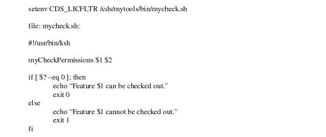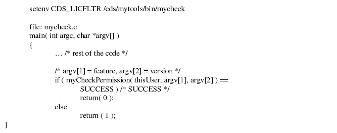 - The product will either continue or exit depending on the return status of the filter program. If the return status of the filter program is 0, then the product will continue and try to check out the requested license. If the client filter program returns a non-zero status, then the product will not checkout a license and return with an error status.
