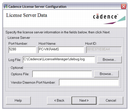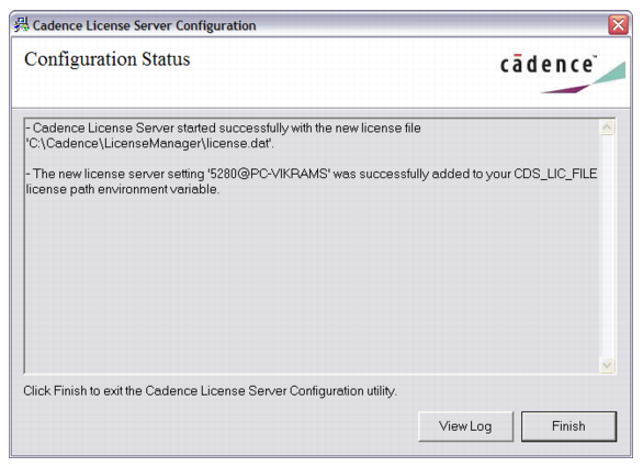 The TCP/IP port number for the Cadence vendor daemon cdslmd to communicate with lmgrd. This can be left blank. By default, the port is chosen during runtime (recommended). However, for some sites with Internet firewalls, you may need to specify the TCP/IP port number for the vendor daemon and allow the port in your firewall for the vendor daemon and lmgrd to communicate.- Click Next to complete the configuration process.