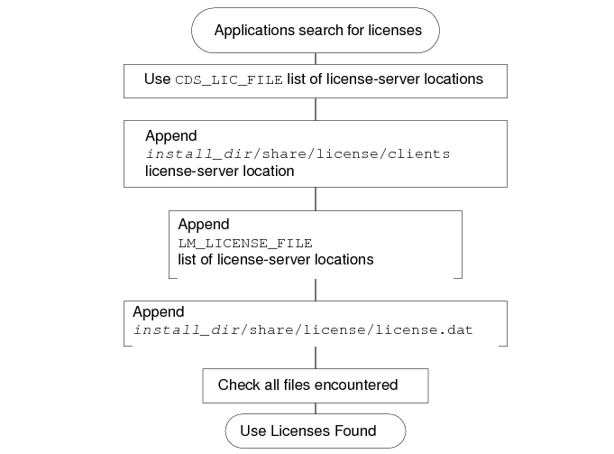 The application must find the correct license-server location. This figure summarizes how Cadence products build a list of license-server locations.