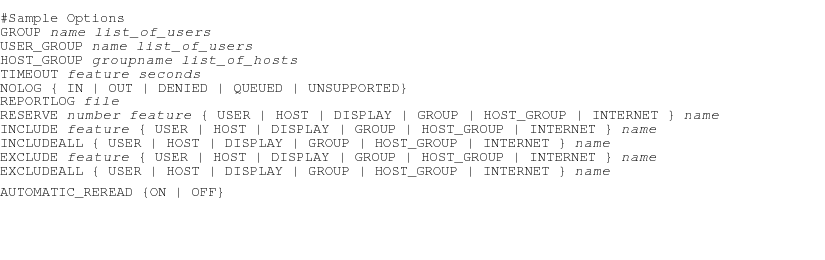 Creating groups usually makes the options file easier to maintain because you do not need to list individual users or hosts. The FlexNet license manager cannot use UNIX groups.