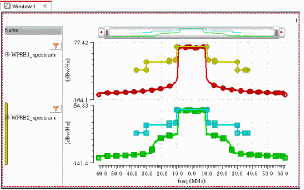 The following example shows how to plot spectrum of the signals to which the wireless probes, WPRB1 and WPRB2 are connected.