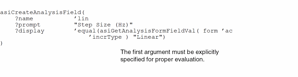The following example shows how you might use the asiGetAnalysisFormFieldVal function to get the value of the incrType field (for an ac analysis) within the display expression for the lin field. In this example, the lin field is displayed on the form only when incrType is "Linear".