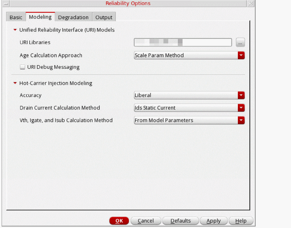 To hide the Hot-Carrier Injection Modeling disclosure and to show the Age Modeling disclosure in the Modeling tab in the Reliability Options form, add the following SKILL code in the .cdsinit file: