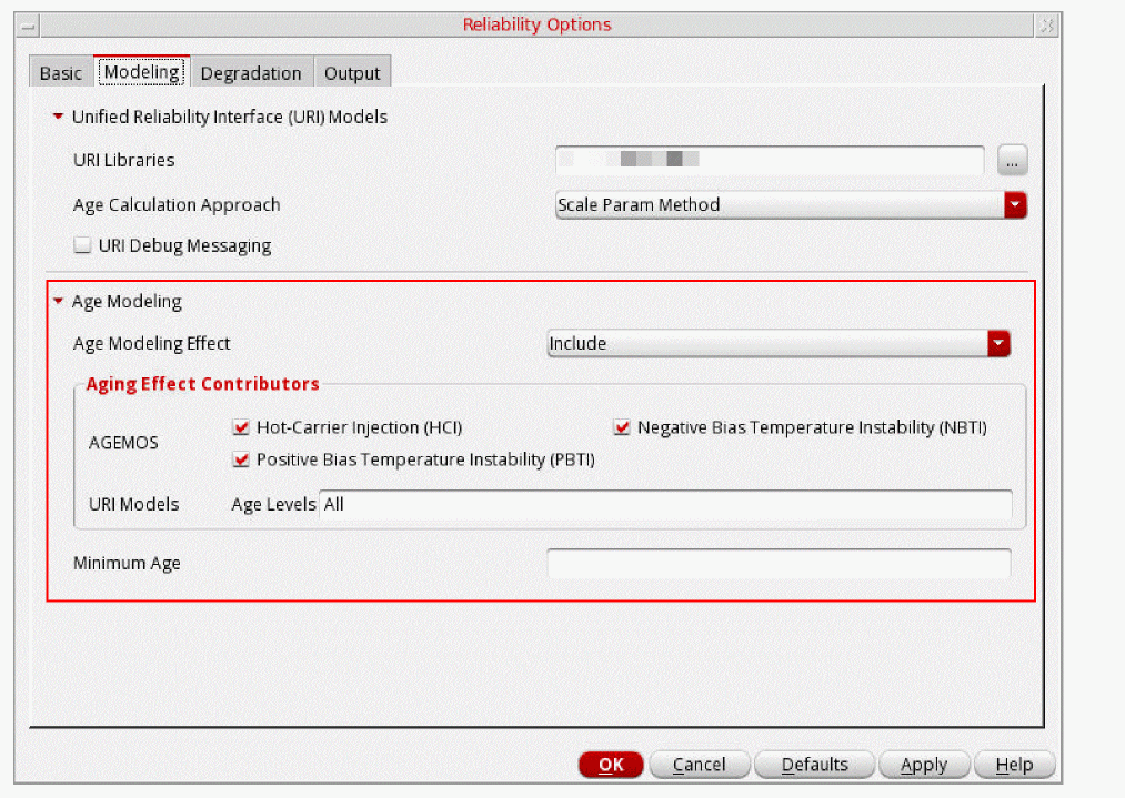 To hide the Age Modeling disclosure from the Modeling tab on the Reliability Options form, add the following SKILL code in the .cdsinit file:
