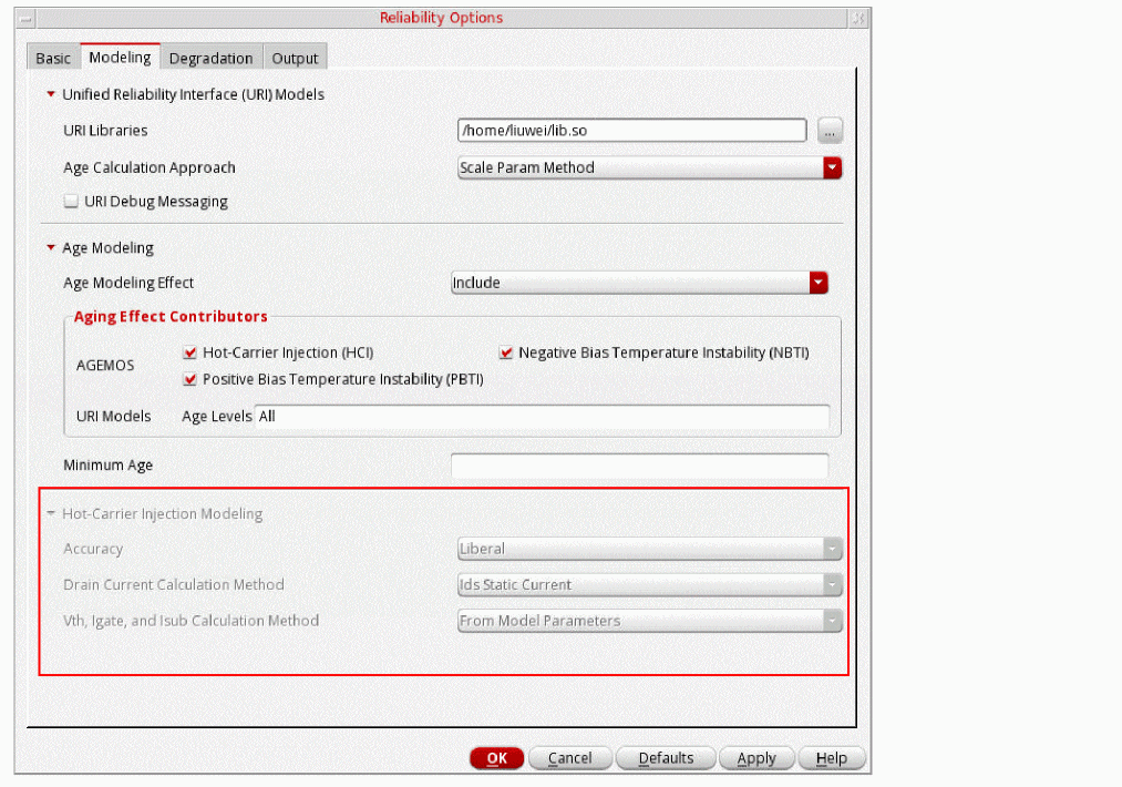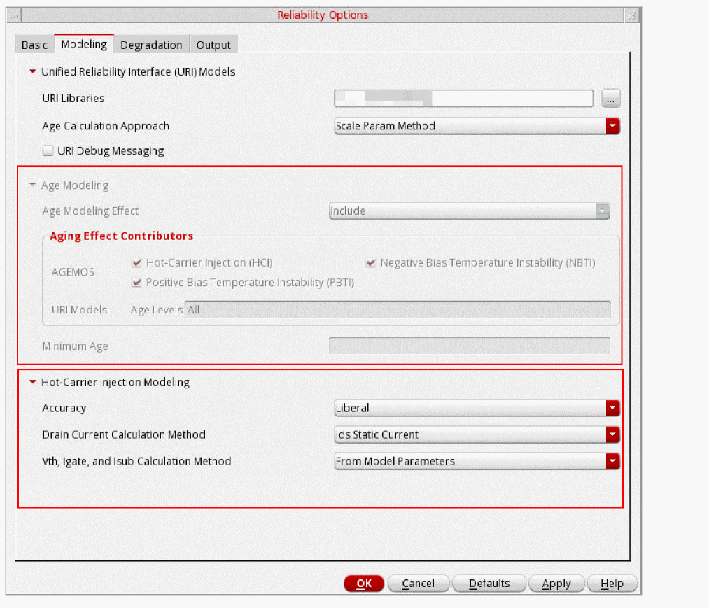 To enable the Hot-Carrier Injection Modeling disclosure and to disable the Age Modeling disclosure on the Modeling tab in the Reliability Options form, add the following SKILL code in the .cdsinit file: