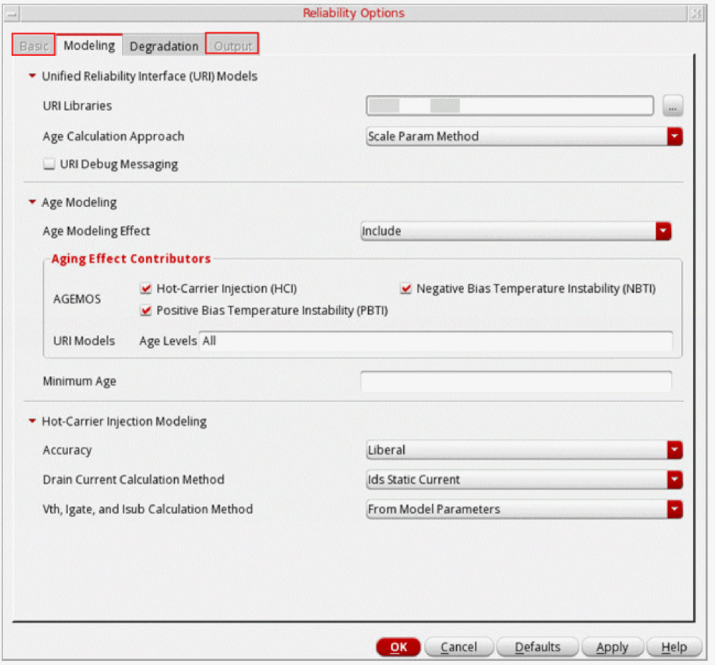 To disable the Basic and Output tabs in the Reliability Options form, add the following SKILL code in the .cdsinit file: