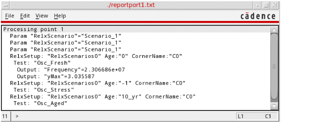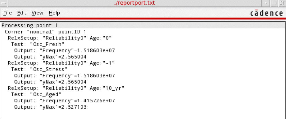 rdb1=maeReadResDB(?historyName "Interactive.3") reportport1=outfile("./reportport1.txt") foreach(point rdb1->points() fprintf(reportport1 "Processing point %L\n" point->id) foreach(param point->params() when(equal(param->name "RelxScenario") fprintf(reportport1 " Param %L=%L\n" param->name param->value) ) ) foreach(relxSetup point->relxSetups() fprintf(reportport1 " RelxSetup: %L Age:%L CornerName:%L\n" relxSetup->name relxSetup->age relxSetup->cornerName) foreach(test relxSetup->tests() fprintf(reportport1 " Test: %L\n" test->name) foreach(output test->outputs() unless(output->value=='Error || !output->value fprintf(reportport1 " Output: %L=%L\n" output->name output->value)