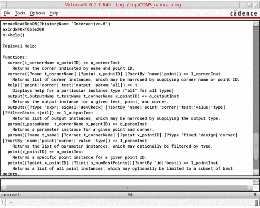 foreach(out pt->outputs(?type 'expr ?sortBy 'corner) printf("corner=%s, test=%s, output=%s, value=%L\n" out->cornerName out->testName out->name out->value) ) corner=C0, test=test1, output=VAR("val1"), value=99.22984 corner=C0, test=test1, output=freq_res, value=5.112893e+08 corner=C0, test=test2, output=(((xmin(mag(IF("/I0/p1")) 1) / 1000000) - 200) * 4), value=1299.23 corner=C0, test=test2, output=myCalib, value=99.22984 corner=C0, test=test2, output=calib_dummy, value=1 (axlrdbo@0x18476638 axlrdbo@0x18476620 axlrdbo@0x184765f0 axlrdbo@0x184765c axlrdbo@0x18476590)