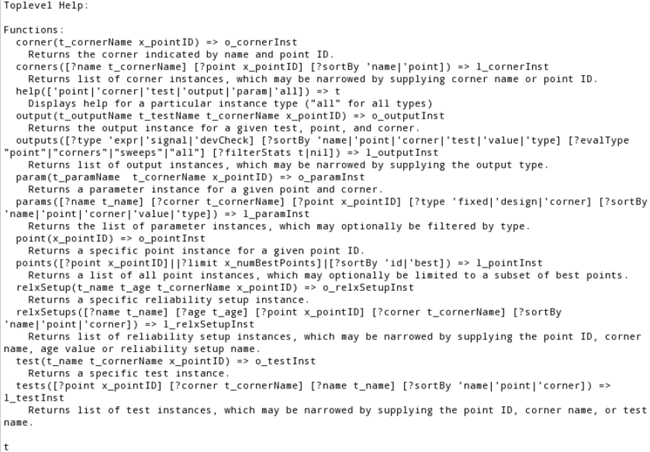 In addition, the result database provides a function help() for each object of the above mentioned types to displays the list and description of functions that can be called using that particular object. For example, function call help('corner) displays a list of all the functions that can be called using an object of type corner. help('all) displays help for all the object types.