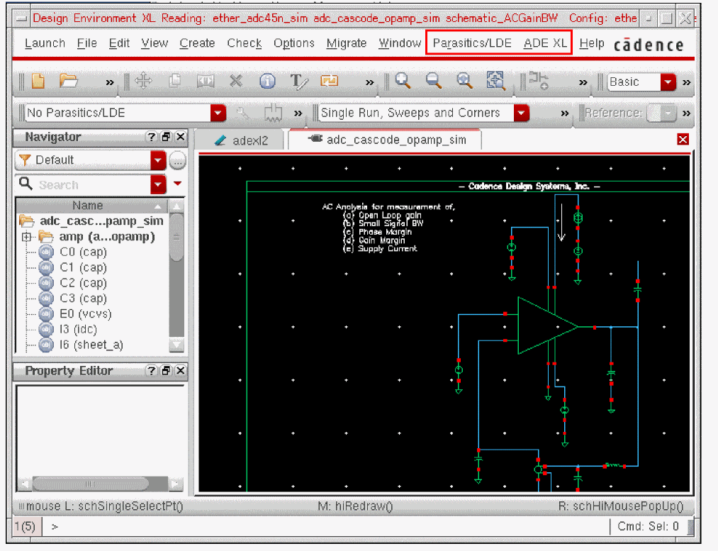 When you open a schematic or a layout in a new tab in a window for a maestro cellview, the menus for that maestro cellview are also displayed on the schematic or layout tab, as highlighted in the figure shown below.
