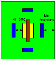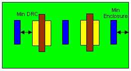 While setting DRC rules between two devices, you must consider the maximum of the minSpacing or minClearance values obtained from the Process Rule Editor on each of the two devices.