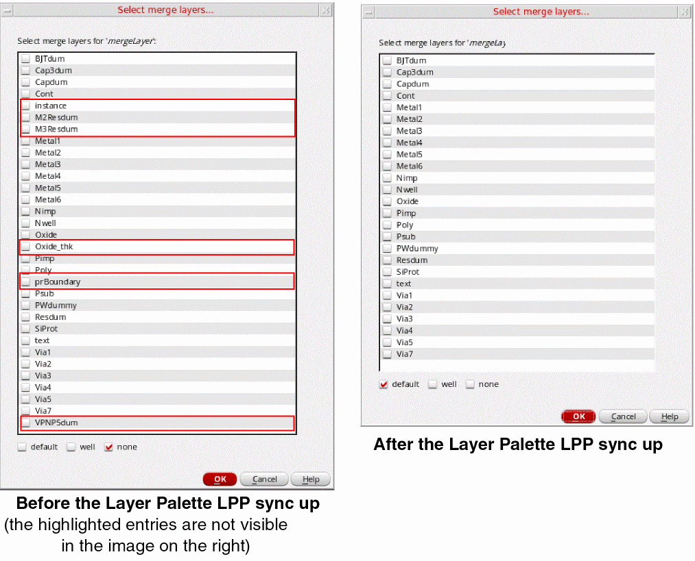 When you enable layer synchronization and change the filters in the Palette assistant using the Used, Valid, and Routing check boxes, layers of specific categories are displayed in the merge layers list box. This change is visible when you update the filters in the Palette assistant and then launch the Select merge layers form.
