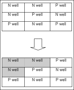 In addition, you can merge multiple layers, such as Nwell and Oxide_thk. Before merging layers, only the top-level net connectivity between the layers is checked. So, layers across devices that have different master Pcells can also be merged. An example for well merging is shown below: