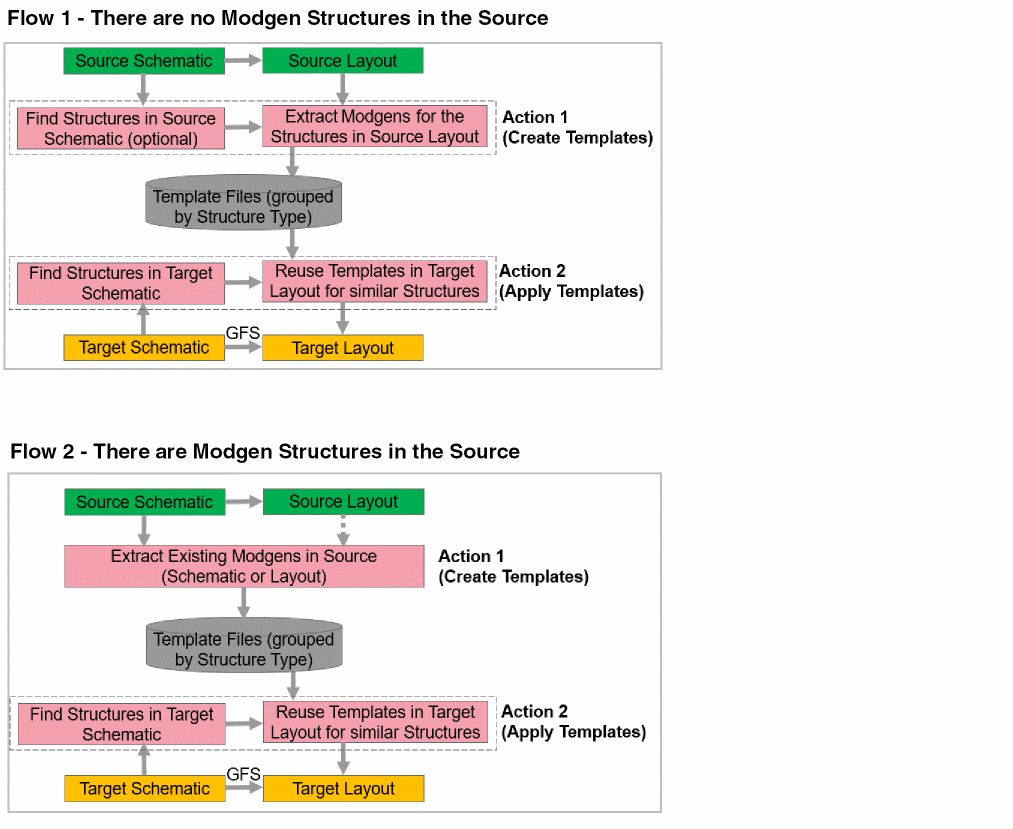 - The tool extracts Modgens from the source layout for important structures in the source schematic (Flow 1) and for existing Modgens, if available (Flow 2).