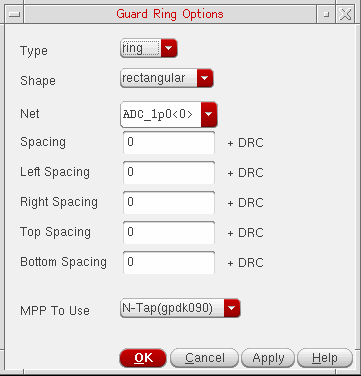 You can specify one common spacing value to define the separation between all four sides of the guard ring and the devices, or a different value for each side. This spacing value is in addition to the minimum DRC distance. So, when creating a guard ring, the Modgen tool first finds the minimum DRC location at which to place the guard ring, examining each layer, then adds the specific spacing values to that distance in order to calculate the final location.