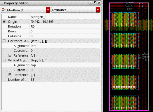 You can use the Property Editor assistant to interactively update the properties of individual Modgen instances and Modgen arrays containing stack-type members. Any changes you make to the instance properties are immediately applied to the Modgen in the layout canvas, as displayed in the figure below.