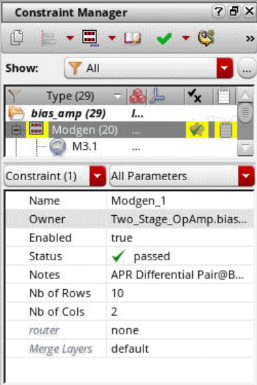 You can specify Modgen parameters, such as the number of rows and columns, the type of router, and the interdigitation pattern, in the Constraints Manager.