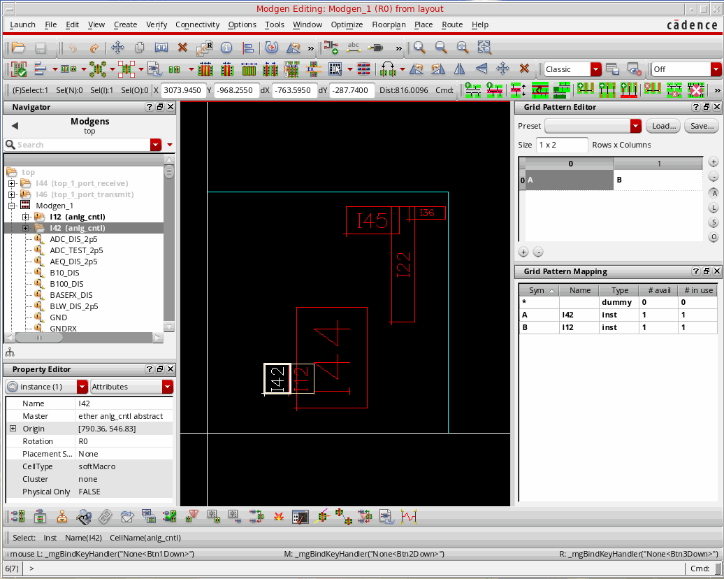 Typical Virtuoso commands such as Edit—Delete are not supported in the Modgen Editor mode.
