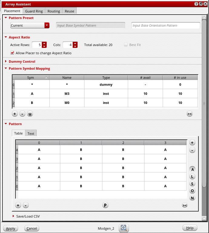 The Routing tab is available only when the Array Assistant is launched from the Constraint Manager assistant. In the Virtuoso automated device placement and routing flow, the tree router is used for routing. Therefore, the Routing tab is not available when the Array Assistant is launched from the Auto P&R assistant. - Reuse Modgen Templates: Use the Reuse tab of the Array Assistant to load and save settings to Modgen template files.
