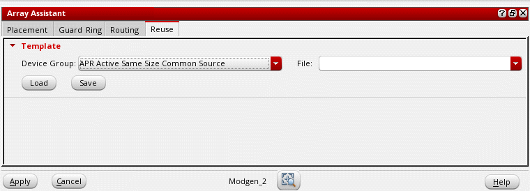(Layout EXL and Higher Tiers) The Reuse tab of the Array Assistant provides options to load and save settings to Modgen template files.