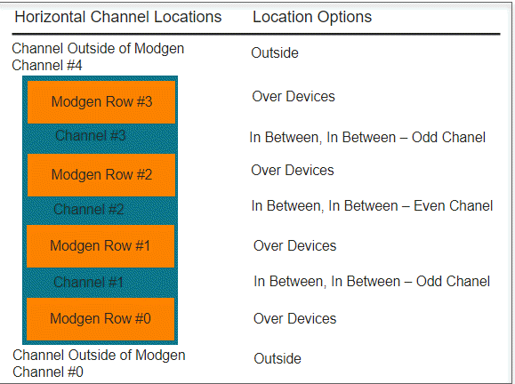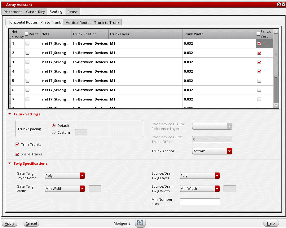 (Layout EXL and Higher Tiers) The Routing tab of the Array Assistant provides options to use the pin to trunk router to define Modgen topology patterns. This involves specifying routing preferences for horizontal nets and vertical nets. Modgen topology patterns help you to visualize, configure, and store routing information. Omit this task if you want to use any other router, such as the tree router, to route the Modgen devices.
