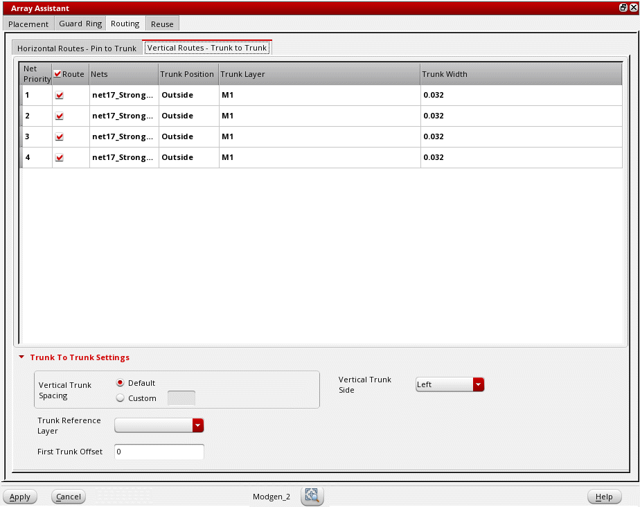 This option is available only when Trunk Position of at least one net is set to Over Devices. When the field is left blank, the cell boundary of the Modgen is used as the reference layer. - Set Trunk Anchor to either Top (top-left vertex of the device row) or Bottom (bottom-left vertex of the device row).