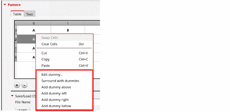 Dummy properties are automatically reset to defaults when you change the pattern of the entire Modgen, for example, when you apply a base pattern, a different pattern using the Text tab, or a preset pattern. However, pattern edits that are localized to a portion of the pattern grid, for example, editing or adding dummies, rows, or columns, do not impact the dummy configurations.