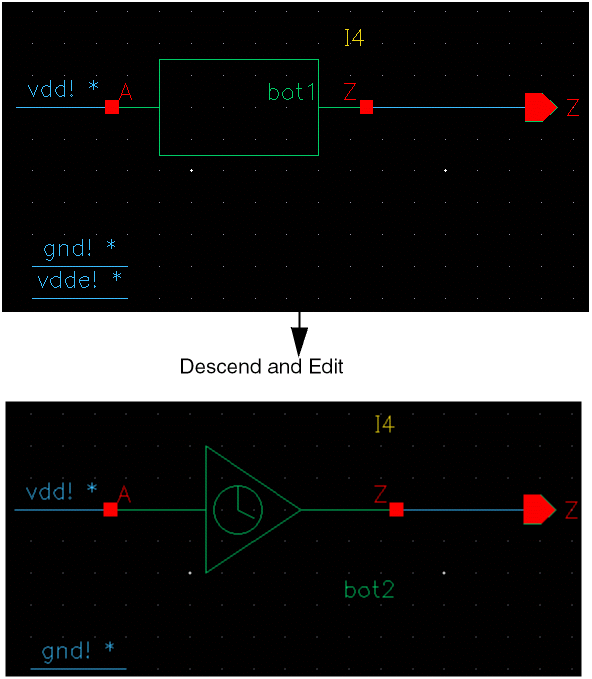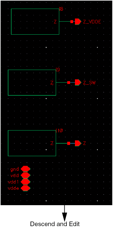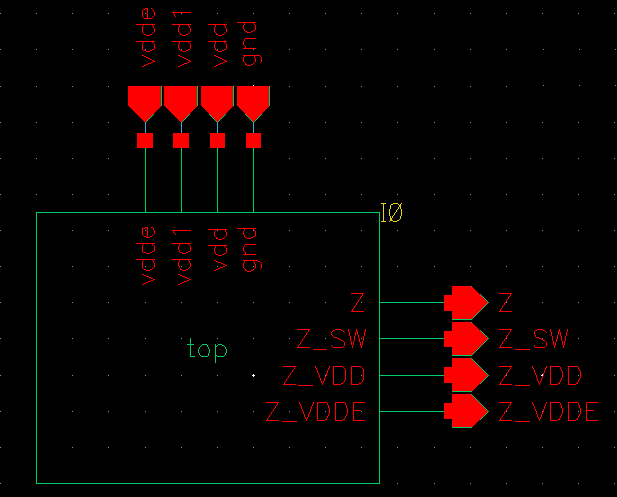 The following figure shows a Verilog design that uses terminals with inherited connections for power and ground supplies.