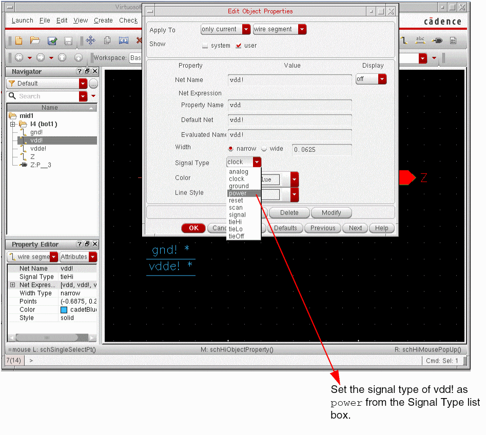 You can set sigType of a net or terminal in Virtuoso Schematic Editor or in Virtuoso Symbol Editor by using one of the following: