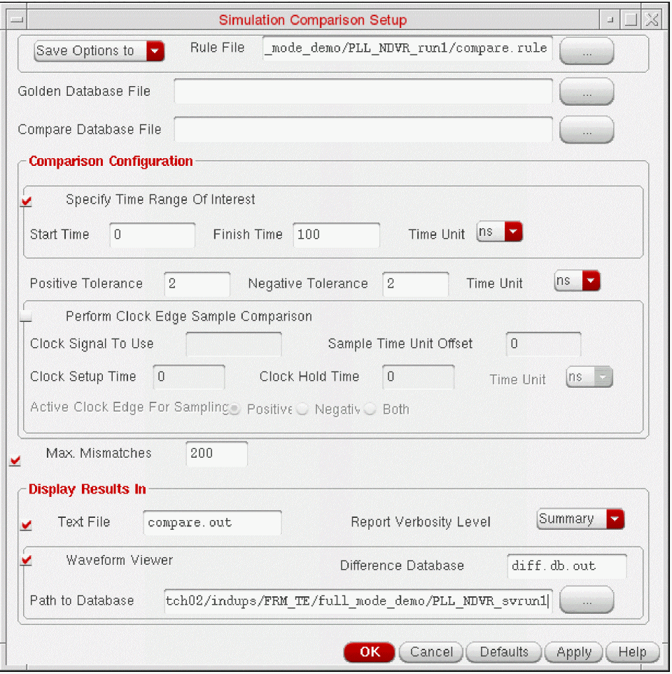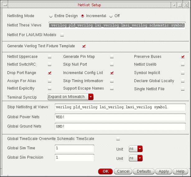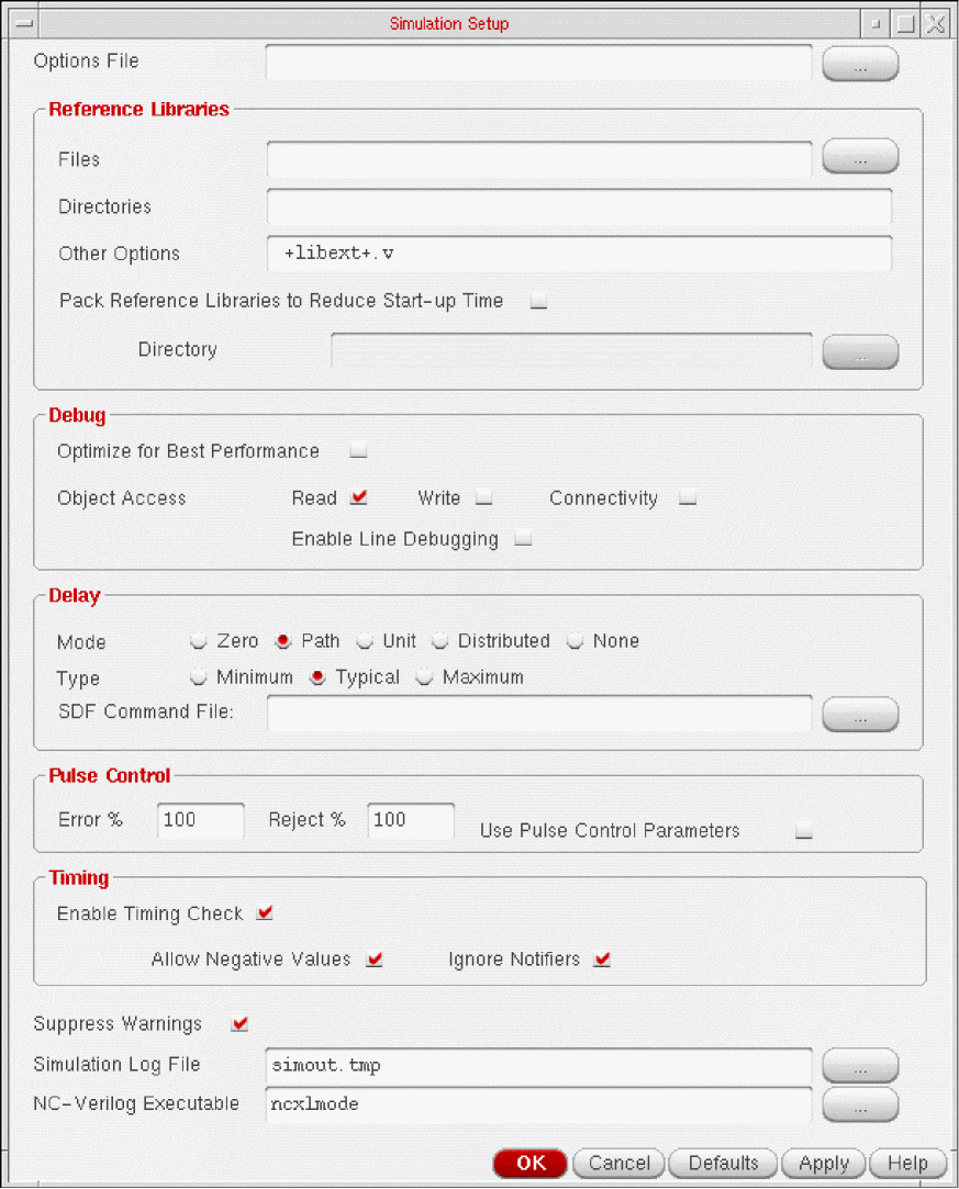 The default option settings for the NC-Verilog forms are set by the system when you enter an empty run directory. The initial settings are supplied with the software. When you edit the default settings on a form, the system saves the new settings to the .vlogifrc file. The .vlogifrc file settings override the default setup options supplied with the NC-Verilog software or supplied by a user in an .simrc file.