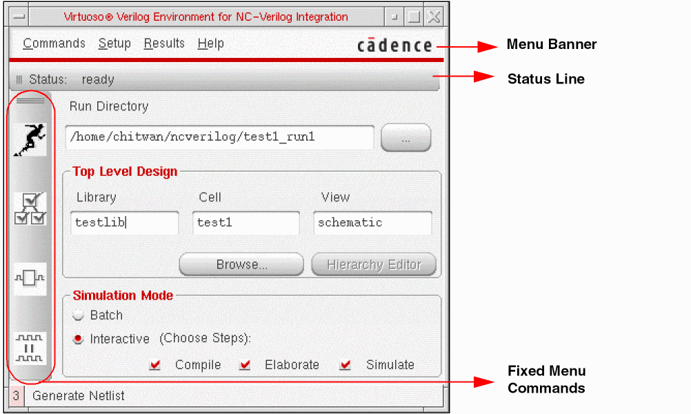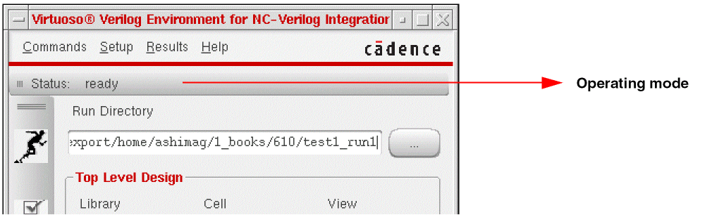 The Virtuoso® Verilog Environment for the NC-Verilog Integration window (main NC-Verilog window) gets displayed when you first enter the NC-Verilog Integration Environment. The main NC-Verilog window provides access to simulation commands, command forms, and support tools.