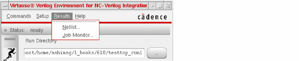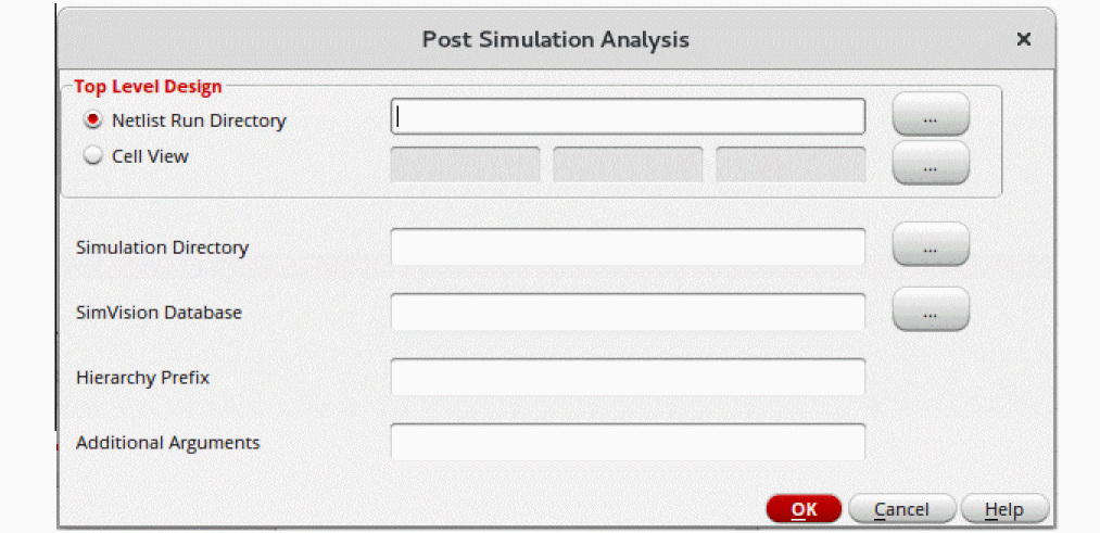The Run Directory field is used to specify the name of the directory for design netlisting, simulation and waveform database creation. You can specify a new or already existing directory name in this field. For more information, refer to Initializing a Design.