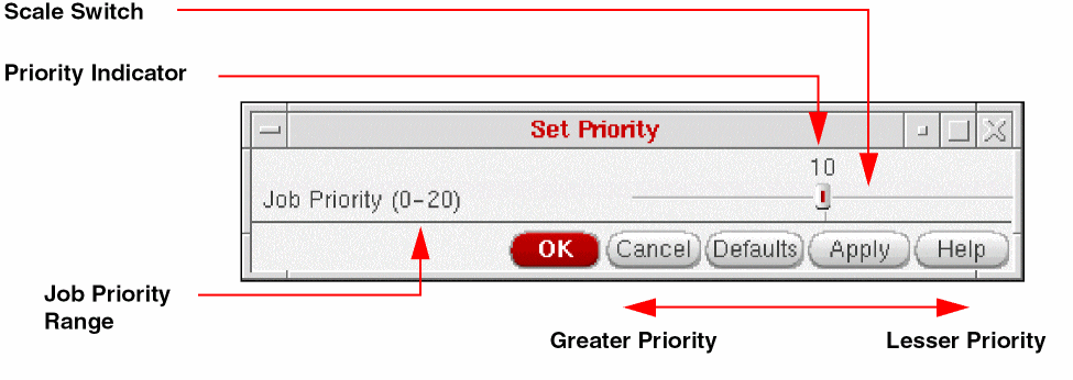 Set Priority displays the Set Priority form. You can use the Set Priority form to specify the priority of the selected job by dragging the scale switch left or right. The number above the scale switch changes as you drag the scale. A larger number indicates a lesser priority. When you decrease the priority of a particular batch job, the system can process jobs with higher priorities faster.