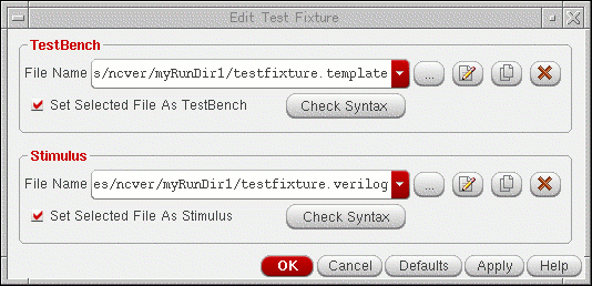 testfixture.verilogandtestfixture.template, respectively. You can edit these default files or copy them to create new files using the Edit Test Fixture form. For more information, refer to Chapter 6, “Working with the Stimulus”. -