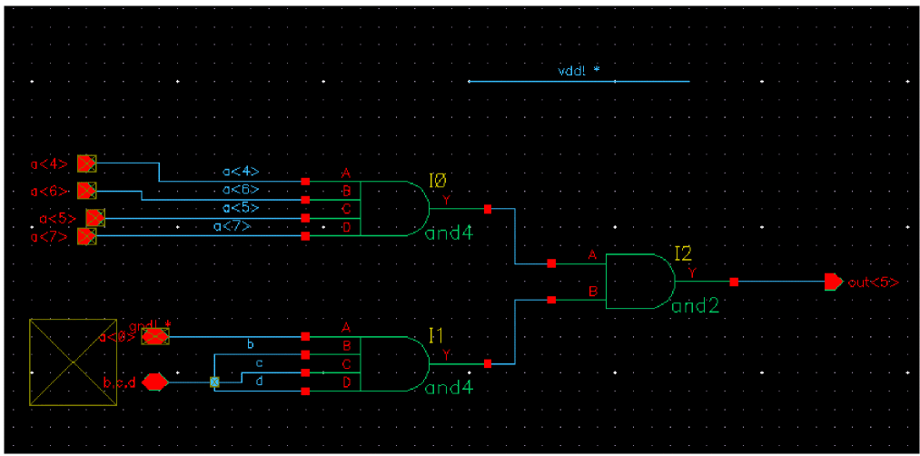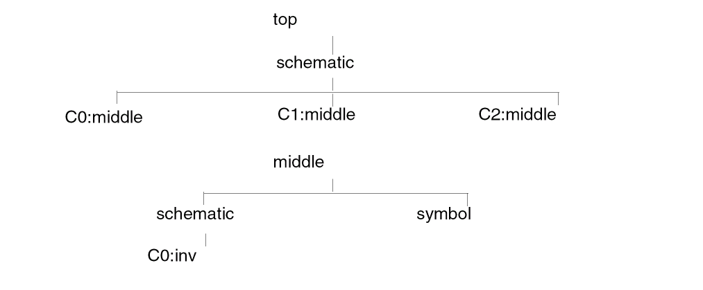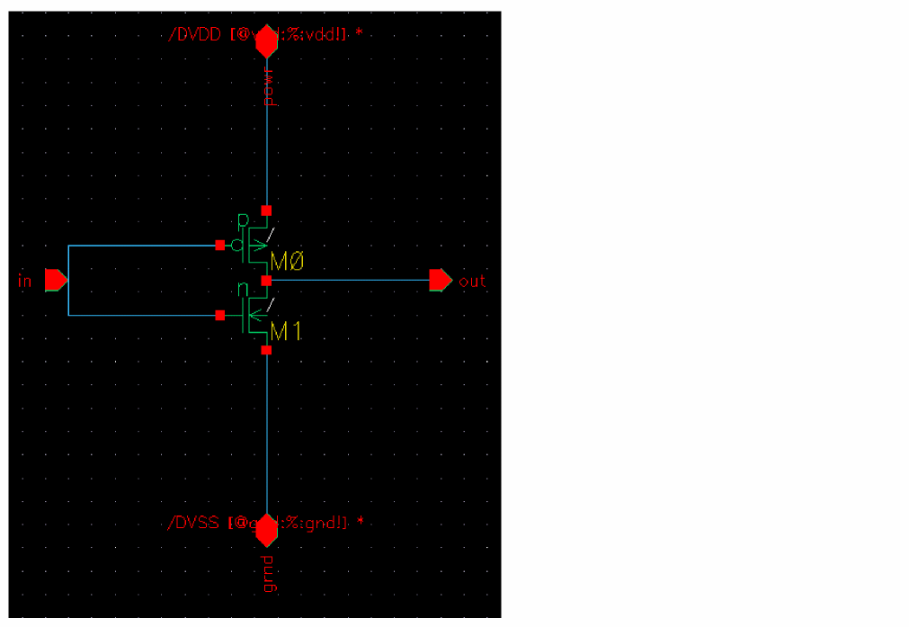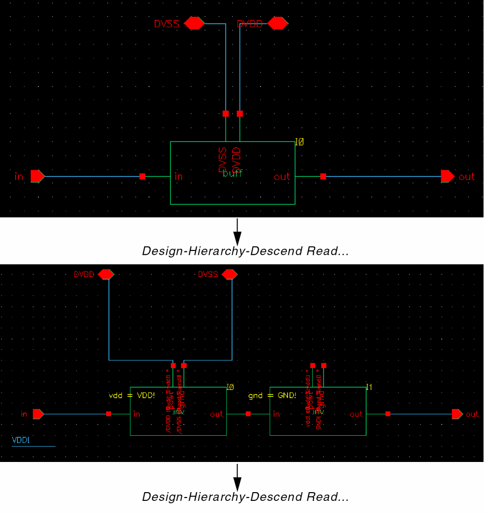 Similarly by setting the properties gnd and vdd to gnd! and my5V respectively in instance I2, we redefine the topmost net in the inverter schematics referenced by instance /I2/I3 and /I2/I4 to be the net my5V. The bottom net is mygnd!