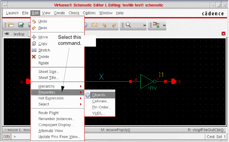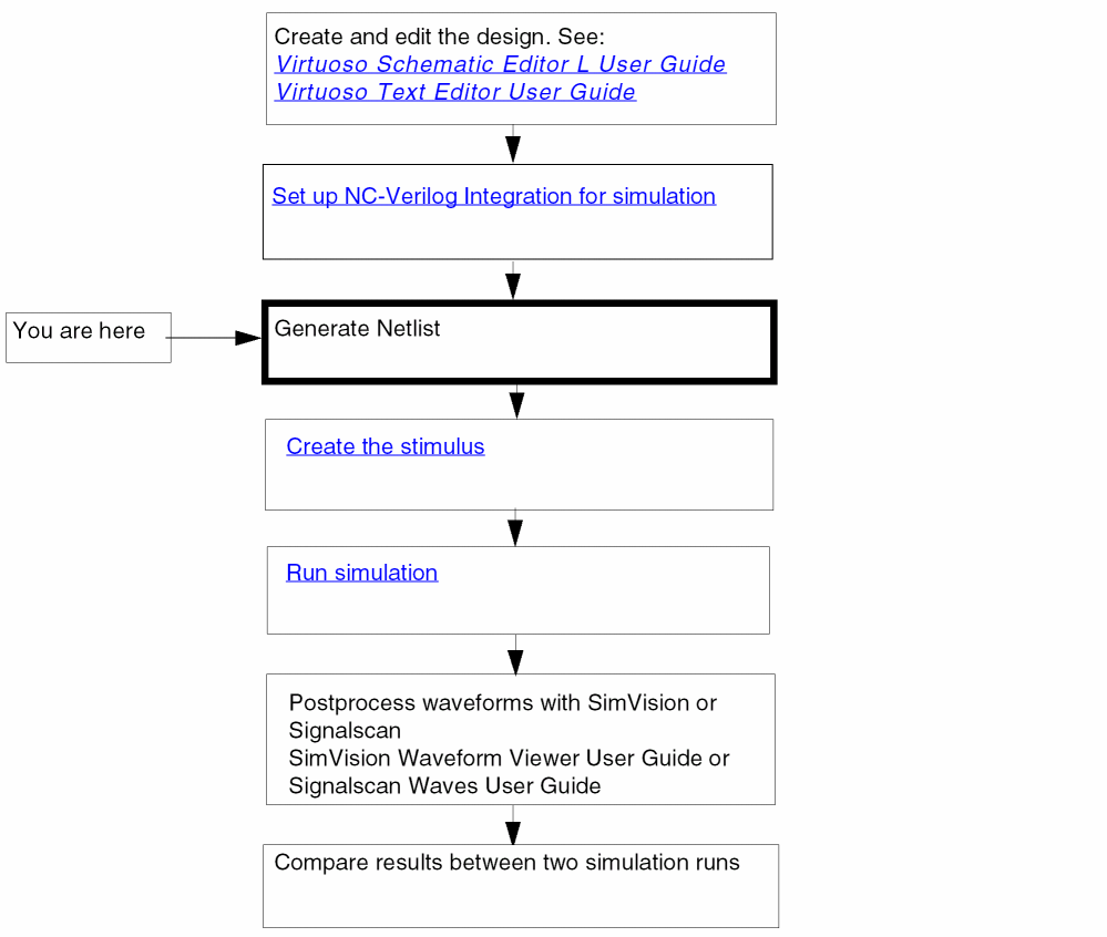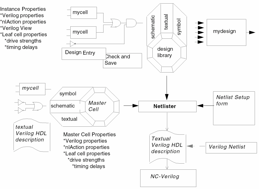When you netlist your design, the netlister reads from the top level schematic or the HDL textual view of your design, checking for instance names, connectivity, any properties you have given to instantiations of cells, and properties that you assign to instantiations that take precedence over the properties assigned to the master cells. The result is a textual description of your design and a test fixture template. This chapter describes the following: