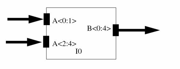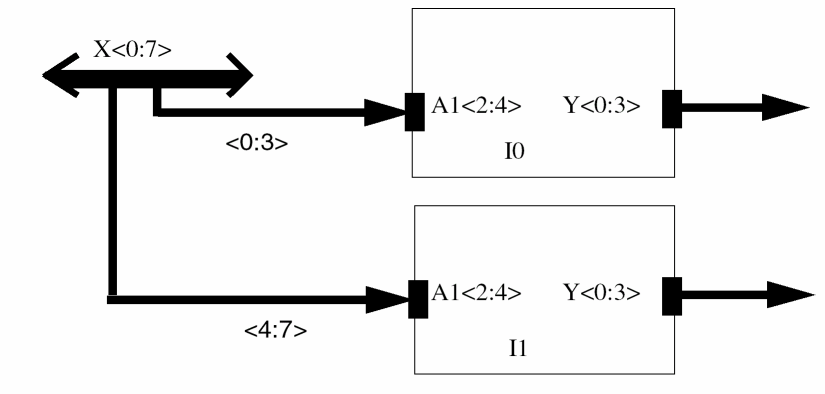 In this case, bus X is shared between instances I0 and I1 where the Most Significant Four Bits of bus X is connected to terminal A1 of instance I0 and Least Significant Four Bits of bus X is connected to terminal A1 of instance I1.