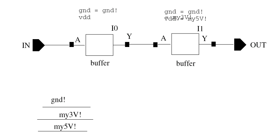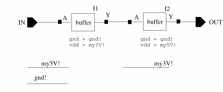 Now, consider the user instantiating these components (or blocks built out of these components) at some arbitrary level of hierarchy above, who needs to redefine vdd! to mean my5V and my3V respectively.