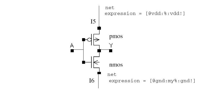 In the schematic view of the cell inv, instead of using the general power and ground symbols, nets have been connected to those two nodes, and labels attached to them allowing inherited redefinition of the net name. The power connection (vdd!) has been defined to be the expression [@vdd:%:vdd!], which is interpreted as “set the name of this net to the name assigned to the property vdd, if you find it; otherwise, the default name of this net should be vdd!.” The default net must be global.