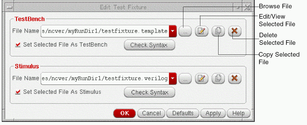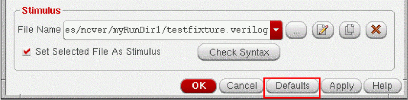 The File Name field in the Testbench and Stimulus sections of the Edit Test Fixture form show the names of the testbench and stimulus files to be used for simulation. If you have generated netlist for your design for the first time in a new run directory, names of the default files are displayed. Otherwise, names of the files used in the last simulation run are displayed.
