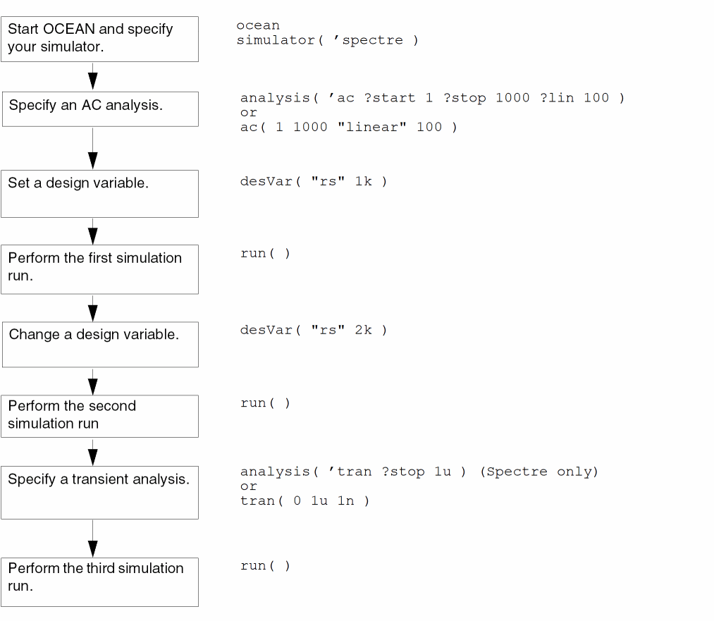 The following figure shows a typical set of simulation tasks that you might perform interactively in OCEAN with the corresponding commands.