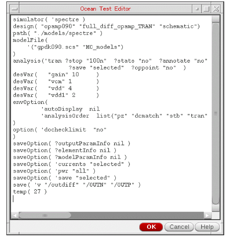 The OCEAN Test Editor form appears in which the OCEAN commands saved in the script are displayed.The OCEAN Test Editor form is a text editor specified by using the