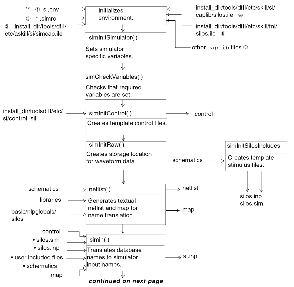 The simcap.ile file is read in from the install_dir/tools/dfII/etc/skill/si directory. This file is written in SKILL syntax and contains general variable default settings and function definitions. It is provided by Cadence as part of the simulation environment, and should not require modification to integrate your simulator. In addition to setting defaults, at the end of this file are calls to functions defined in SE. These functions are executed as the file is loaded. The simcap, caplib, hnl, fnl code is searched for in the following order: