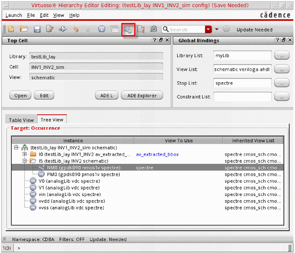 To netlist the design correctly, apply occurrence binding using Hierarchy Editor, as illustrated below, so that instance /I5/NM0 is bound to spectre.