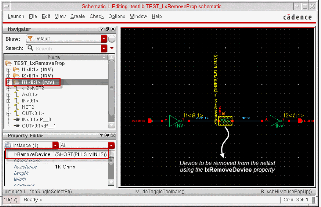 The following figure illustrates how you use thelxRemoveDeviceproperty in the Property Editor assistant of Schematic Editor.