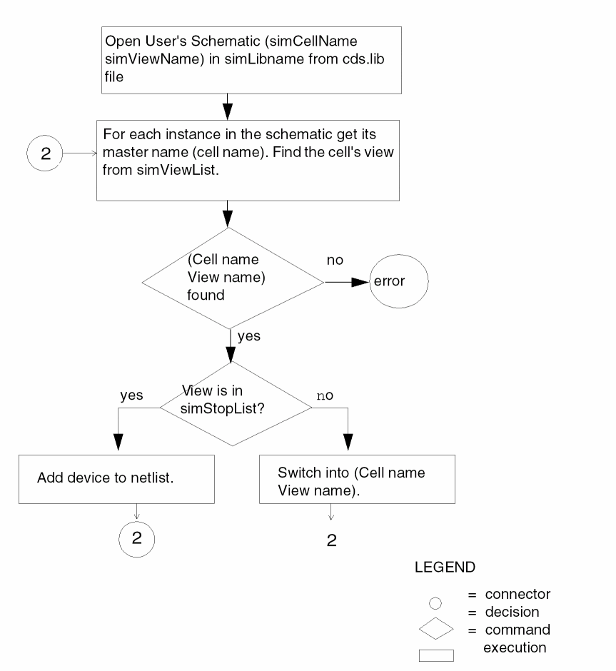 If you find a cellview with a view name from the simViewList, check to see if the view name is also in the simStopList. If the view name is a stopping point, write out the instance in the netlist file. If you do not find a view name from the simViewList, generate an error message. If the view name does not appear in the simStopList, repeat the Locating Cell View step to expand the cellview.